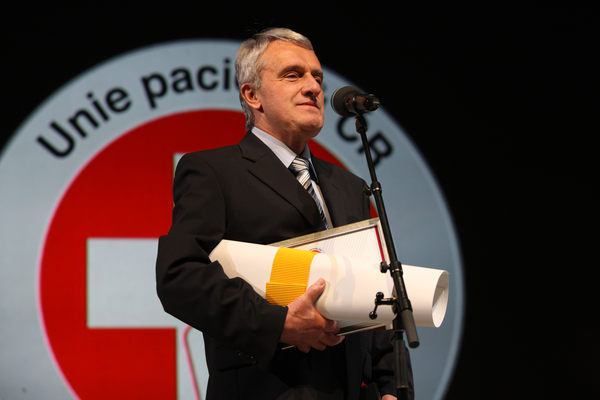 Prim. MUDr. Čestmír Kalík, držitel Hippokratovy ceny za činy lidskosti, přebírá cenu, od zástupce hlavního partnera ankety Lékař roku 2012 pana Mgr. Stanislava Šmerdy – manažera obchodní jednotky společnosti Takeda Pharmaceuticals CZ s.r.o.